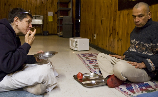 Mathura, left, and Jay, two Hare Krishna monks, share a meal in a room adjacent to the temple's sanctuary. Monks spend much of the day on their own projects and chanting the mantra, so meals are one of the few events that bring them together. |