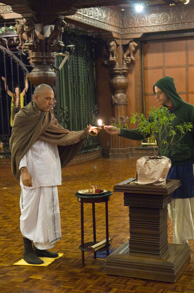 “Want to play something?” Devananda asks Chris. They sing the maha mantra and pop music that sprung from the Hare Krishna movement. “Really want to show you, Lord,” the pair sings, drowsily strumming their guitars to George Harrison’s reverent tribute to the maha mantra. “That it won’t take long, my lord. My sweet Lord.” |